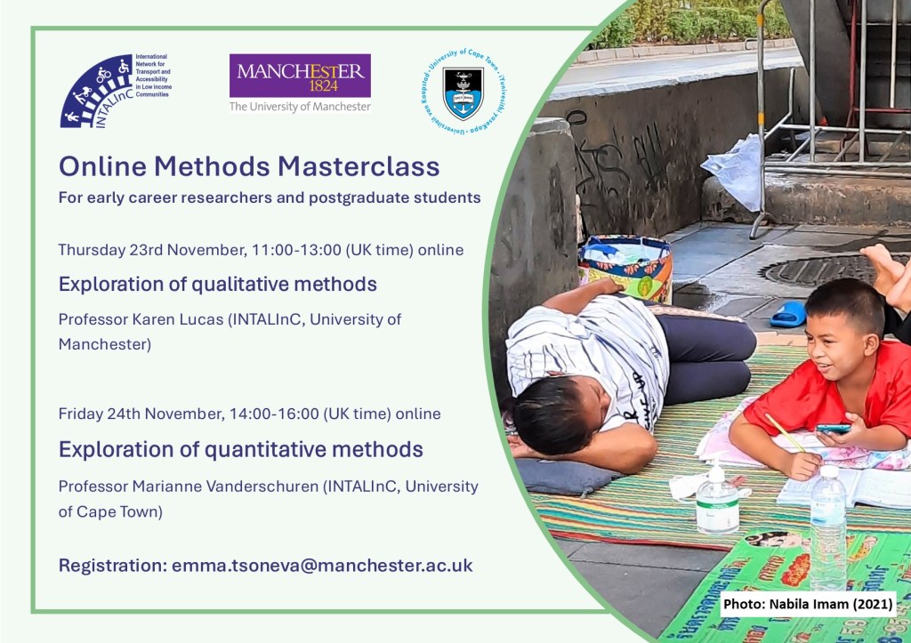 The masterclass will be delivered in two online interactive 2-hour sessions: Exploration of Qualitative Methods at 11:00 am (UK time) on 23rd November 2023 led by Karen Lucas (INTALInC, University of Manchester), and Exploration of Quantitative Methods at 2:00 pm (UK time) on 24th November 2023 led by Marianne Vanderschuren (INTALInC, University of Cape Town). The sessions are free to access and will be delivered over Zoom.